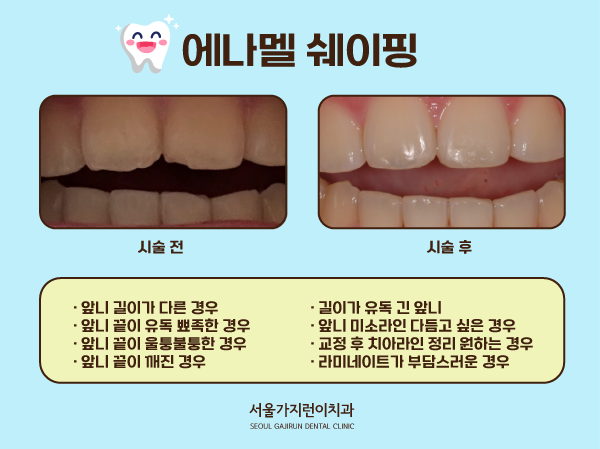 주의할 점이 있다면 치아는 깎은만큼 되돌릴 수가 없는 것인데요. 숙련된 치과의사의 판단에 따라 심한 모양 불균형이나 크기 차이를 에나멜 쉐이핑만으로 해결하기 보다는 라미네이트나 다른 보철치료를 통해 도움을 받아야 한다는 점입니다. 치아교정으로 배열은 맞췄지만 모양이 아쉬울 때는 에나멜 쉐이핑을 통해 간단하게 보완해볼 수 있는데요.