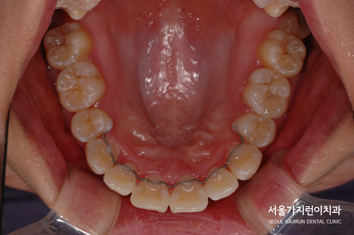 교정이 완료된 이후 모습인데요. 정중선도 맞는 모습을 볼 수 있고 좌우 교합의 균형도 잘 맞아 편측 저작 우려도 해소된 모습을 볼 수 있었어요. 무엇보다 치아의 각도가 제대로 세워지면서 교합선도 자연스러워지고 돌출감도 많이 개선이 되었는데요. 이후 환자분이 집중해줄 부분은 고정식 유지장치를 사용했기 때문에 유지장치 주변으로 치석이 쌓이지 않도록 관리해 주는 것이에요.